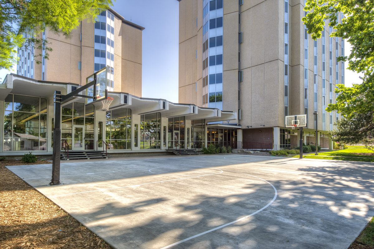 In addition to the interior remodel we completed for the University of Denver, we also upgraded an unused exterior patio to a basketball court. This is a standard sized court with two goals and striping. The court itself is post-tensioned concrete which was designed by the great structural engineers here at EVstudio.