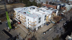 This mixed use development is in Denver on Boulder Street. Aerial photos show the progress of this PT podium supporting 3 levels of wood framing.