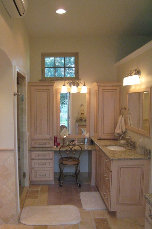 Our client wanted a five piece master bath with washer and dryer and a large master closet to compliment their relocated master bedroom. We were able to minimize costs by tucking the portions of the program that could tolerate a lower ceiling under an existing porch roof so we could avoid any modification of the existing structure. We then elevated the plate height of the addition and added clerestory windows around the new sink areas, vanity, shower and closet to create a strong sense of arrival and feeling of lightness in the areas where our clients spend the most time.