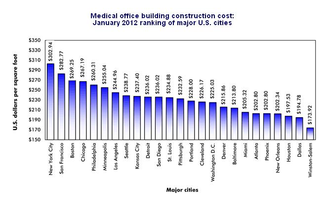 In an effort to keep our information current with the moving economy, I am posting an update to the series on Estimated Construction Costs per square foot for Medical Office Buildings, a project type for which EVstudio has extensive experience. Below is a chart from RSMeans construction cost data that illustrates the cost per square foot for new construction sorted by region from the most expensive to the least expensive.