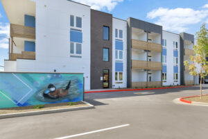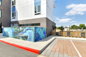 The exterior’s design took on a box shape to match the neighboring buildings. The building’s materials consist of two different tones of blue cement board siding with accents of brick and stained wood. To enhance the visual character of the building, murals and custom fences are placed around the site. Painted murals of birds in shades of blue are located on the trash enclosure and gas meter bank. These works of art turn the functional walls into vibrant works of art that complement the building’s color palette. A custom fence featuring the Parkway Apartments logo are placed around the building, reinforcing identity and character.