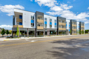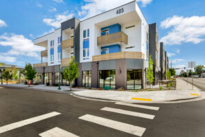 The 405 Parkway Apartments are located in Garden City, Idaho, at the corner of E 42nd Street and N Adams Street. The project includes a 39,300 square foot building that combines residential, retail, and community functions into one cohesive structure. Of this total, 26,500 square feet are dedicated to residential use, while 5,700 square feet are reserved for future retail. The program included three vanilla shells, an office, a parking garage, 39 residential units, and a community room designed to foster resident interaction.
