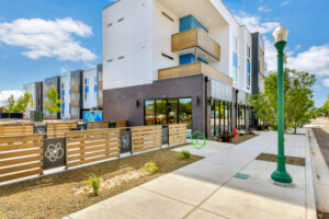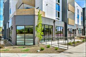 Retail spaces and garages are strategically placed on the first floor to maximize accessibility, along with seven apartment units. The remaining units are arranged on the second and third floors to provide privacy and views. The project offers a variety of unit types, including twenty-six one-bedroom units at 543 square feet, one accessible one-bedroom unit of the same size, six interior two-bedroom units at 846 square feet, and six corner two-bedroom units at 796 square feet.