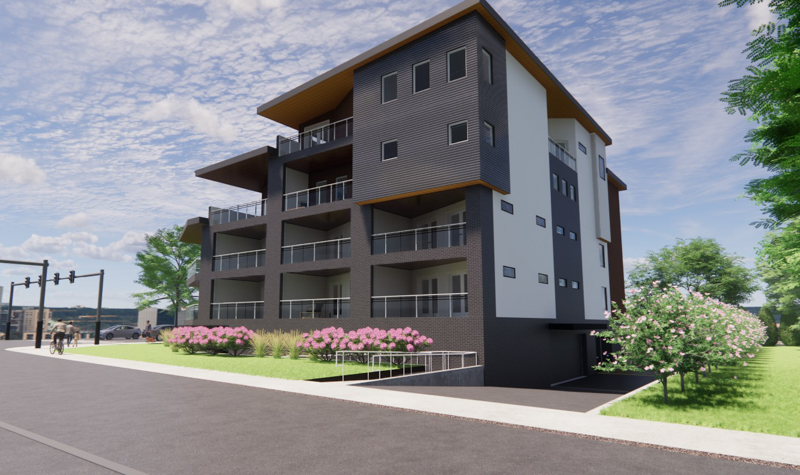 Roosevelt 805 is a modern condo development located in Boise, Idaho, featuring 12 residential units above a partially sub-grade parking garage. Our design team provided architectural, interior, mechanical, and civil services. The project includes the full demolition of an existing structure, making way for the new four-story condo building designed with a unique stepped form and angled wall geometry.