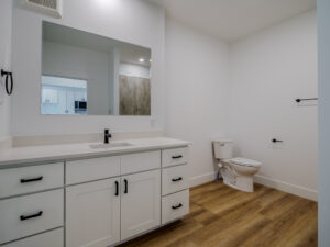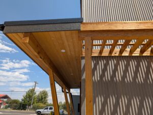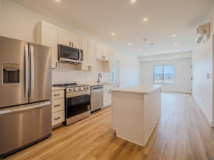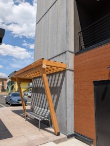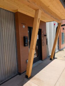 The project utilized modular construction to build a 3-story structure with 32 units. The structure is designed to utilize an innovative Geothermal Heat Pump system that required a site built mechanical room to house the equipment. The exterior is clad in a fiber cement panelized siding and corrugated metal siding that provides fire resistance to the structure and includes unique exterior shades that wrap around the corner of the structure and are shaded on the North and South sides over the entry doors but then become open on the west side. The shades also utilize angled columns to create a dynamic exterior.