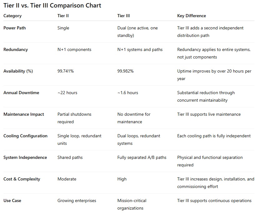This tier serves enterprises and mission-critical users who demand high uptime but seek a cost-effective balance compared to fully fault-tolerant Tier IV designs.