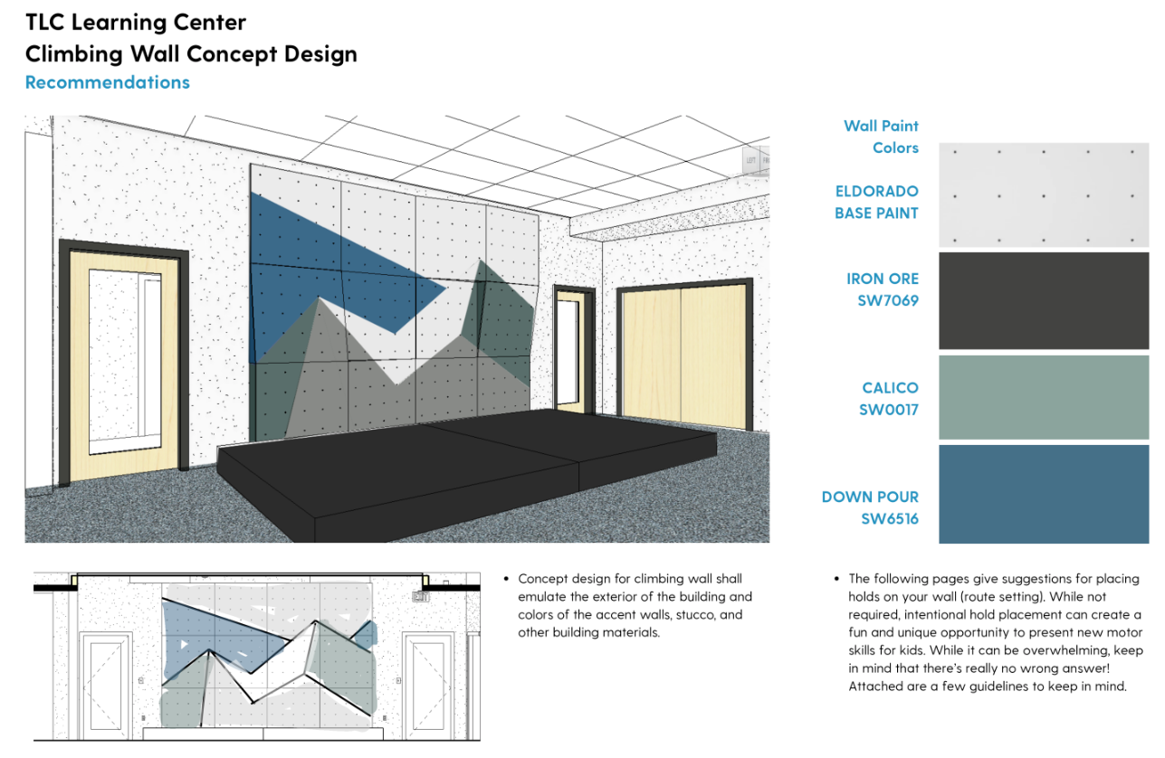 The movement room will feature an engaging climbing wall designed to support a wide range of gross and fine motor development, helping students build strength, balance, coordination, and spatial awareness. With varied holds and routes, the wall encourages problem-solving, confidence, and body control, allowing children to challenge themselves at their own pace while supporting multiple styles of motor growth.