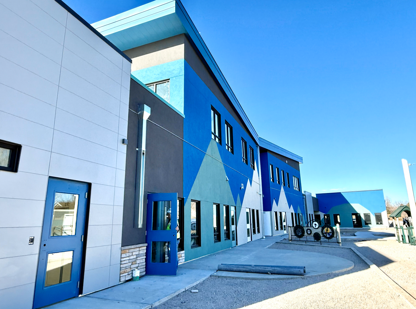 Thoughtful stucco reveals and carefully selected materials create visual interest and texture, echoing the rugged mountain landscapes that define Colorado. These reveals are more than decorative — they engage children’s curiosity and create an inviting presence for families and the community. EVstudio
